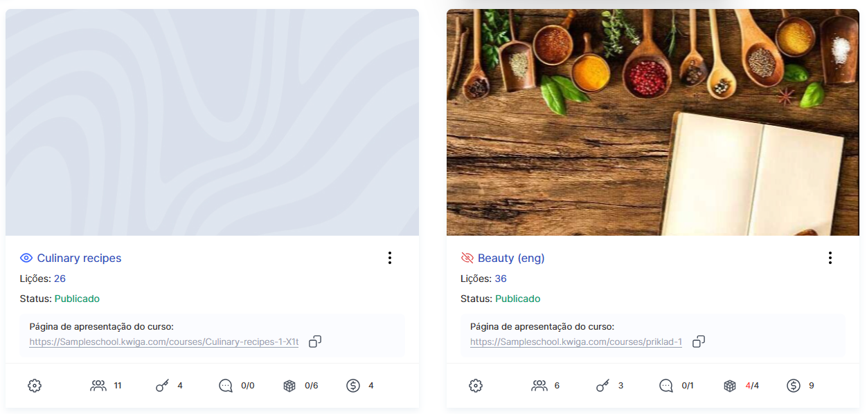 O curso pode ser exibido na página da escola com ou sem uma imagem de capa. A opção com pré-visualização parece muito mais atraente e profissional, ajudando o seu curso a se destacar entre os demais.