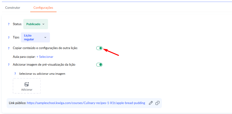 Localize a opção Copiar conteúdo e configurações de outra lição e ative-a (ela deve ficar verde).