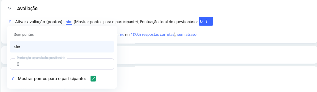 Exemplo: o aluno recebe 1 ponto para cada resposta correta. Em perguntas de múltipla escolha, os pontos são atribuídos a cada resposta correta, permitindo uma avaliação mais precisa dos conhecimentos.