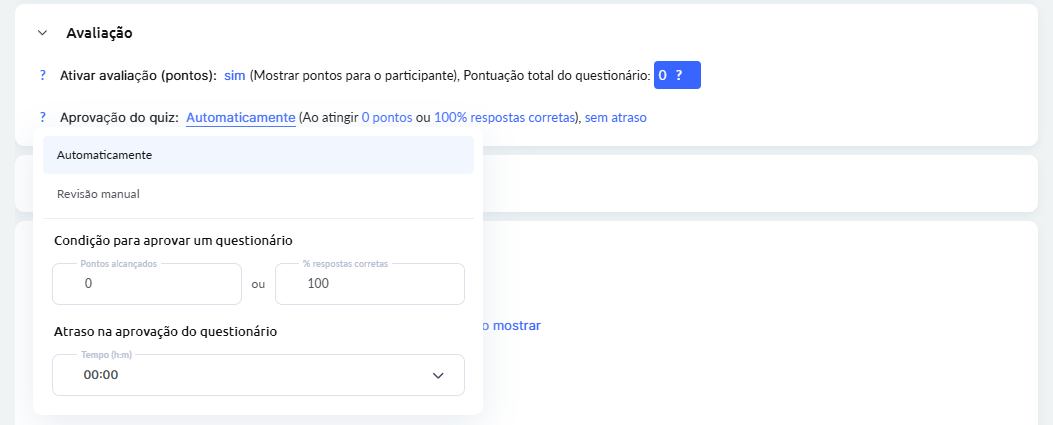 Os resultados são aprovados imediatamente após o cumprimento das condições definidas — por exemplo, quando o aluno atinge a pontuação mínima ou a porcentagem exigida de respostas corretas. É uma solução prática e rápida.