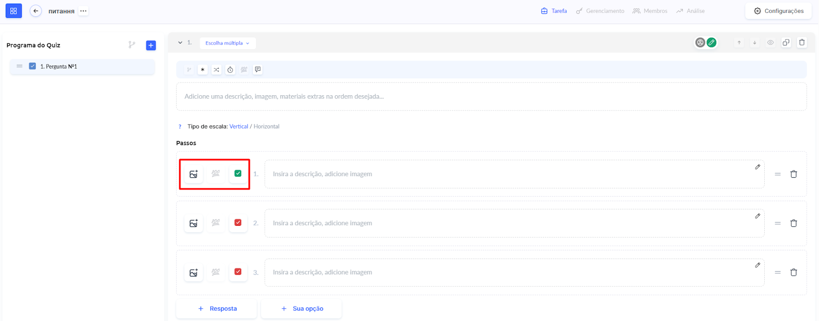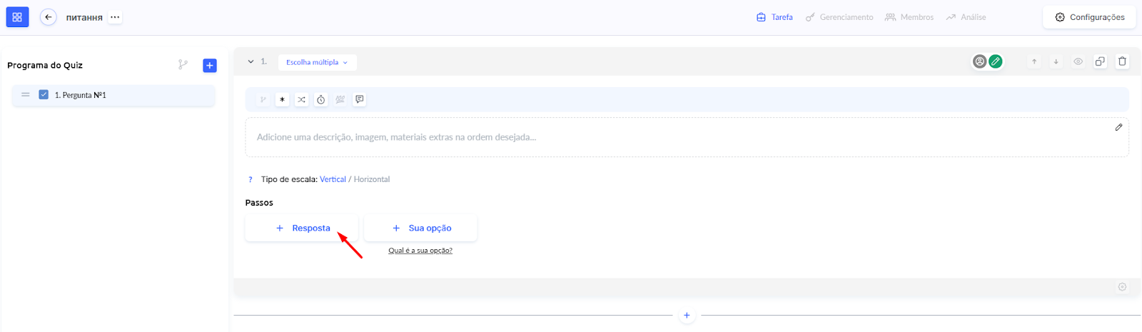 Digite o texto da pergunta e adicione as opções de resposta clicando no botão + Resposta. Você pode atribuir pontos às respostas corretas e marcá-las em verde.