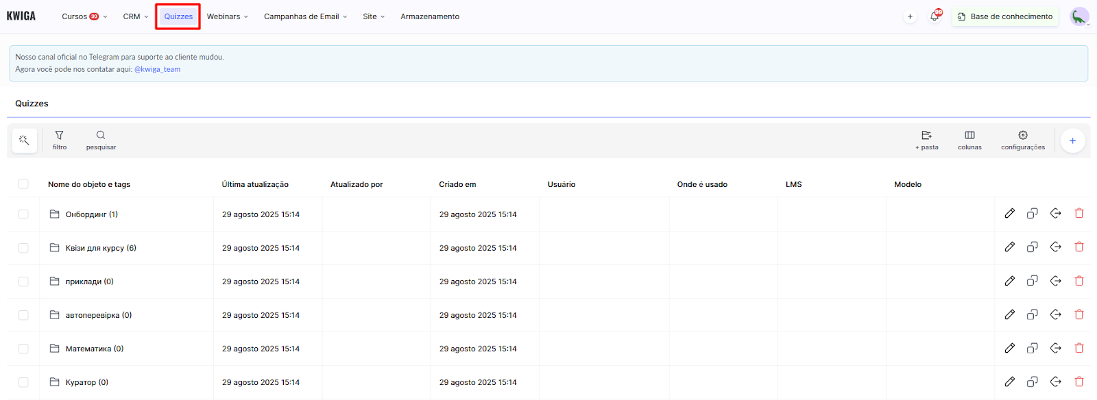 A plataforma Kwiga permite criar testes que facilitam a avaliação dos conhecimentos dos alunos. Os testes são criados separadamente das lições e ficam localizados na seção Quizzes.