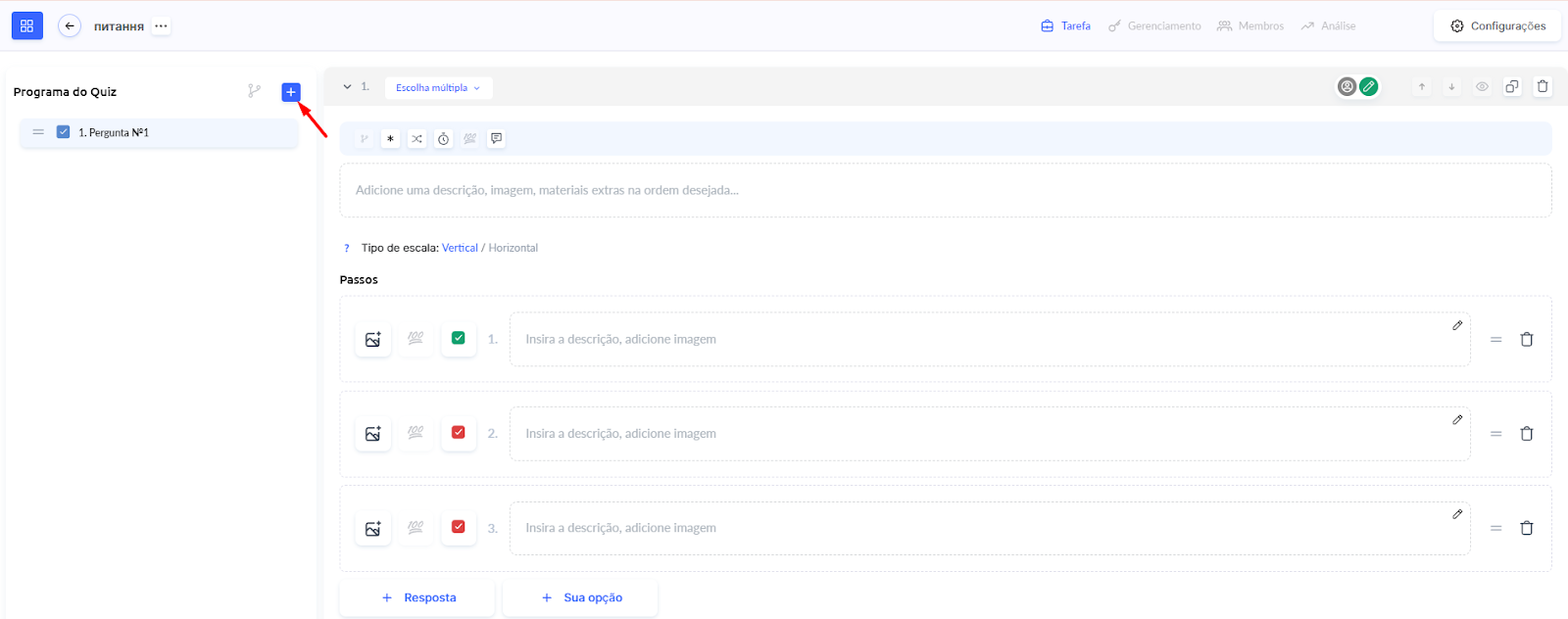 Todas as alterações são salvas automaticamente. Para adicionar uma nova pergunta, use a opção + no editor do quiz. Depois é só escolher o tipo de pergunta, inserir o texto e adicionar as respostas.