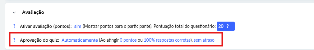 Configurações de aprovação — as condições necessárias para a aprovação do quiz