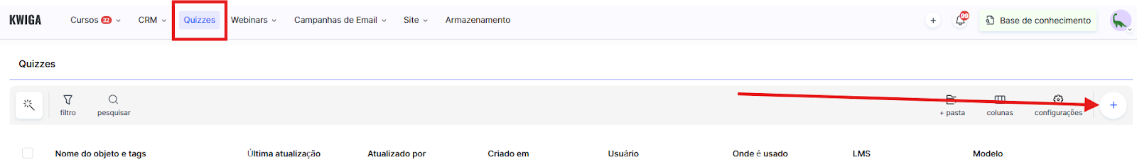 Os testes na Kwiga são criados separadamente das aulas e ficam disponíveis na seção Quizzes.