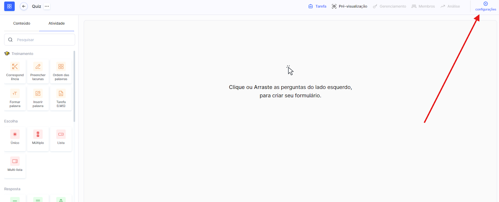 Vá para as configurações do quiz