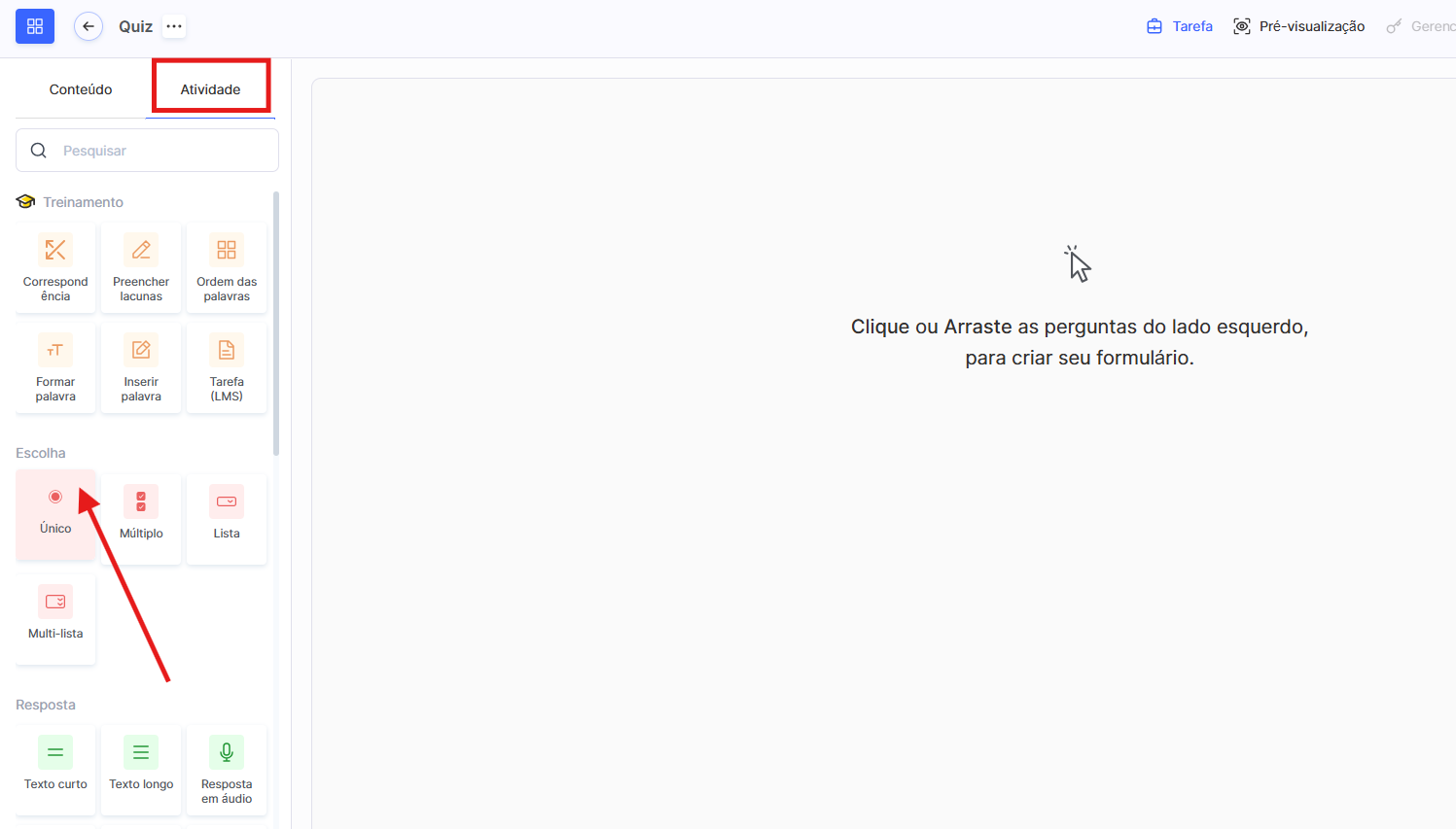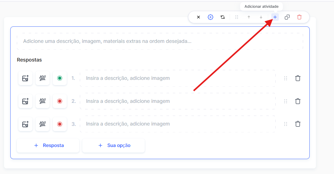 Cada nova pergunta é adicionada usando o botão + Adicionar atividade ou clicando no tipo de pergunta desejado no painel esquerdo.