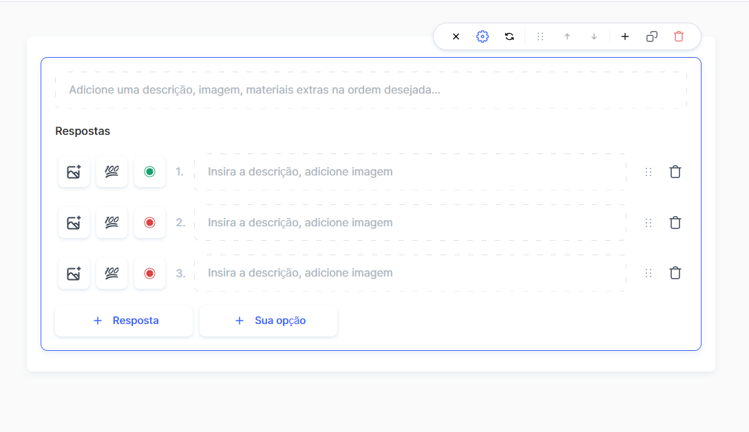 Após esta etapa, você será redirecionado para o editor de testes, onde poderá adicionar perguntas escolhendo o tipo de questão desejado: resposta em texto, texto para preenchimento, escolha de respostas (múltipla escolha), entre outros.