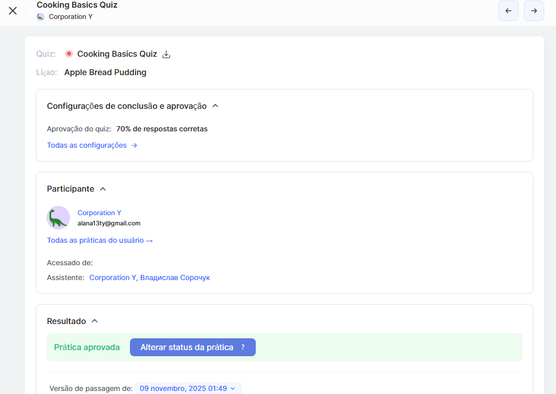 Os resultados são aprovados imediatamente assim que as condições especificadas forem atingidas — por exemplo, a pontuação mínima ou a porcentagem necessária de respostas corretas. Essa solução é rápida e conveniente.