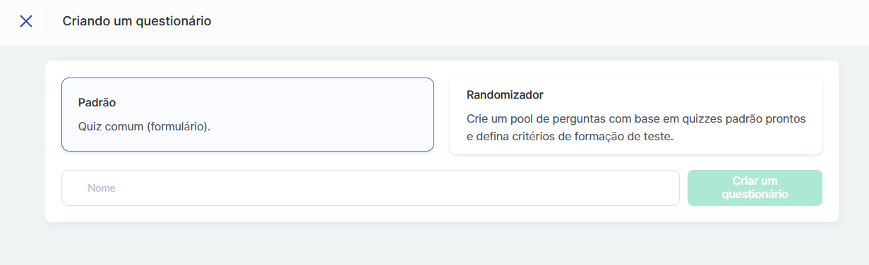Em seguida, selecione Questionário padrão, informe o nome e prossiga para o preenchimento do conteúdo.