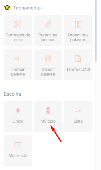 No painel à esquerda, estão disponíveis todos os tipos de perguntas, organizados em categorias para facilitar a navegação.