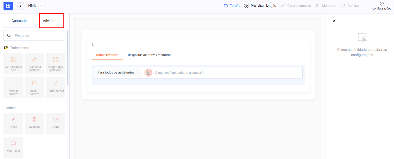 Preencha e configure a atividade, adicionando perguntas e opções de resposta.