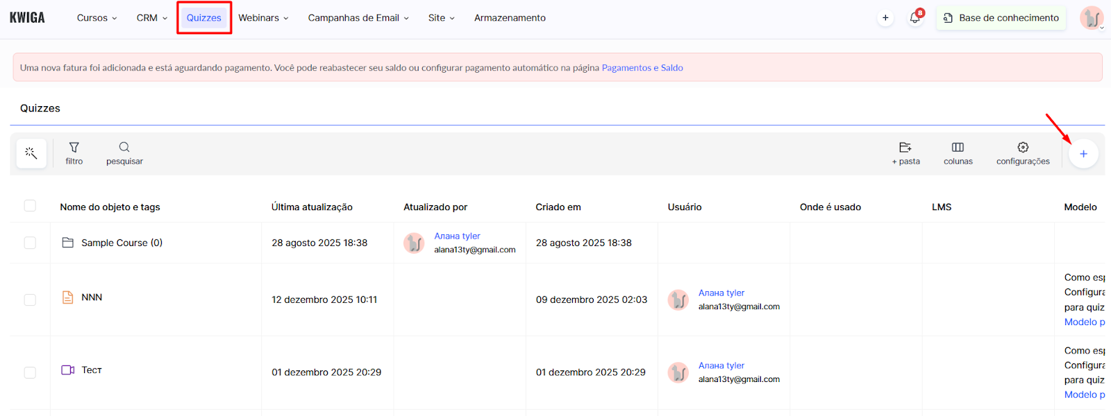 Primeiro, é necessário criar uma tarefa que será utilizada no curso. As tarefas são criadas separadamente do curso. Acesse a seção Questionários e crie uma nova tarefa.