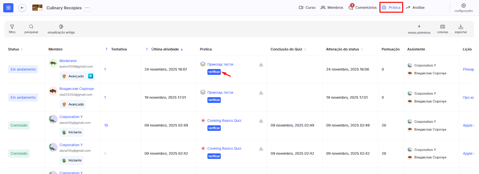 Depois que o aluno concluir a tarefa, ela ficará disponível para revisão no menu Prática do curso.