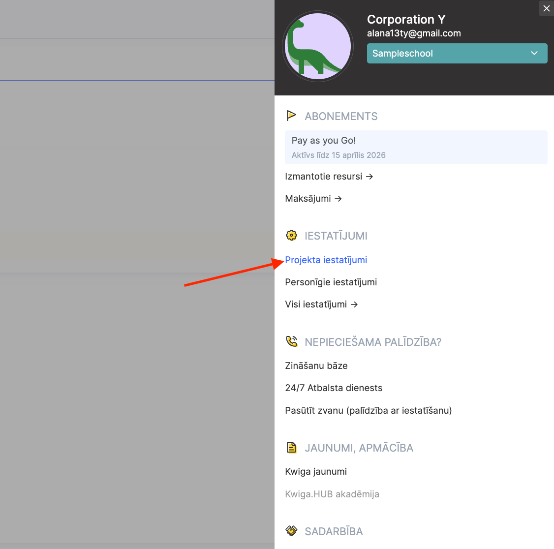 Para configurar o rodapé, clique no avatar do perfil e aceda a Definições do projeto.