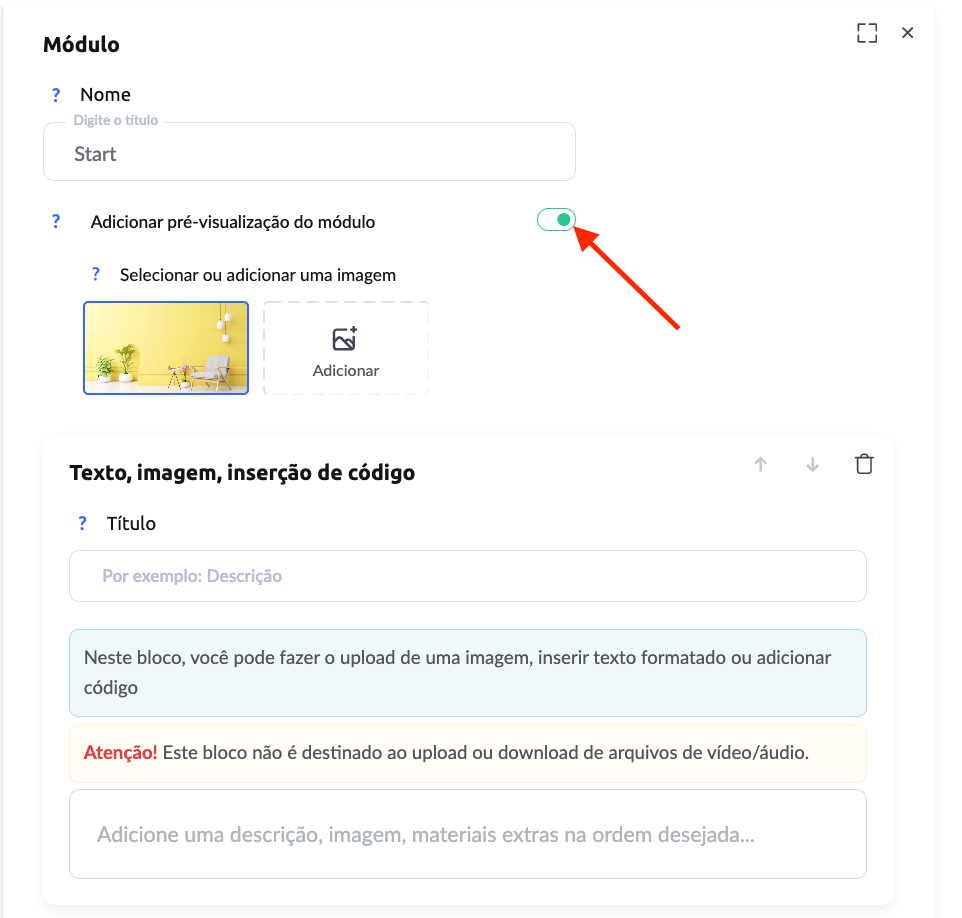 no bloco da direita, indique ou altere o nome do módulo e adicione uma imagem de pré-visualização; ative o botão e carregue uma imagem com o tamanho 1280×720, que será automaticamente reduzida para 75×42