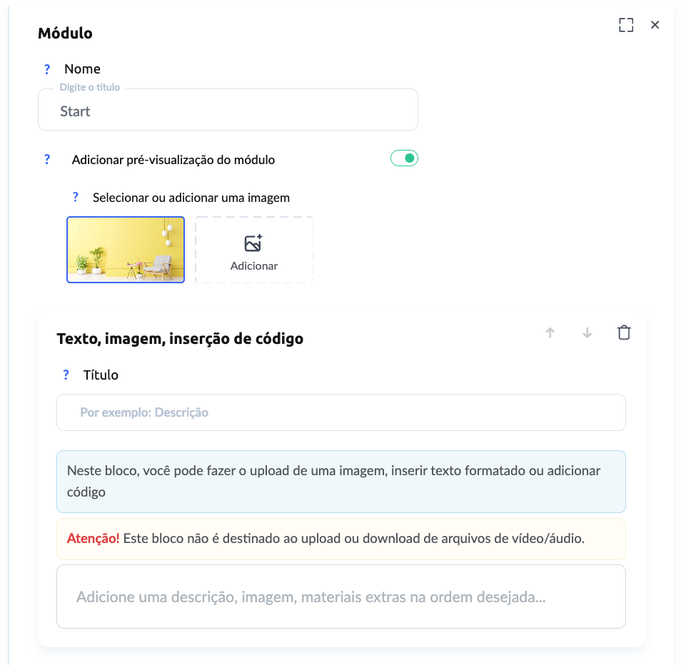 Também pode adicionar uma descrição do módulo para que os alunos saibam o que será abordado nesse bloco.