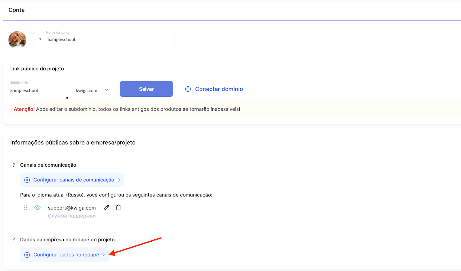 Depois, vá a Informações públicas sobre a empresa/projeto e selecione a opção Dados da empresa no rodapé do projeto.