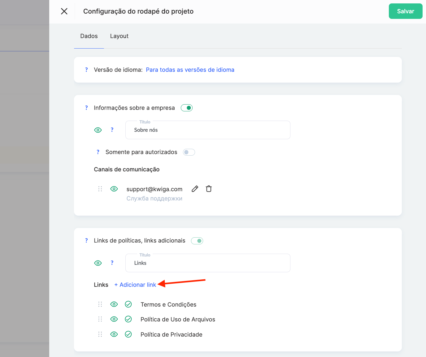 O sistema permite configurar versões linguísticas para um público internacional, ativar ou desativar o bloco Informações sobre a empresa, bem como adicionar links personalizados através do botão Adicionar link.