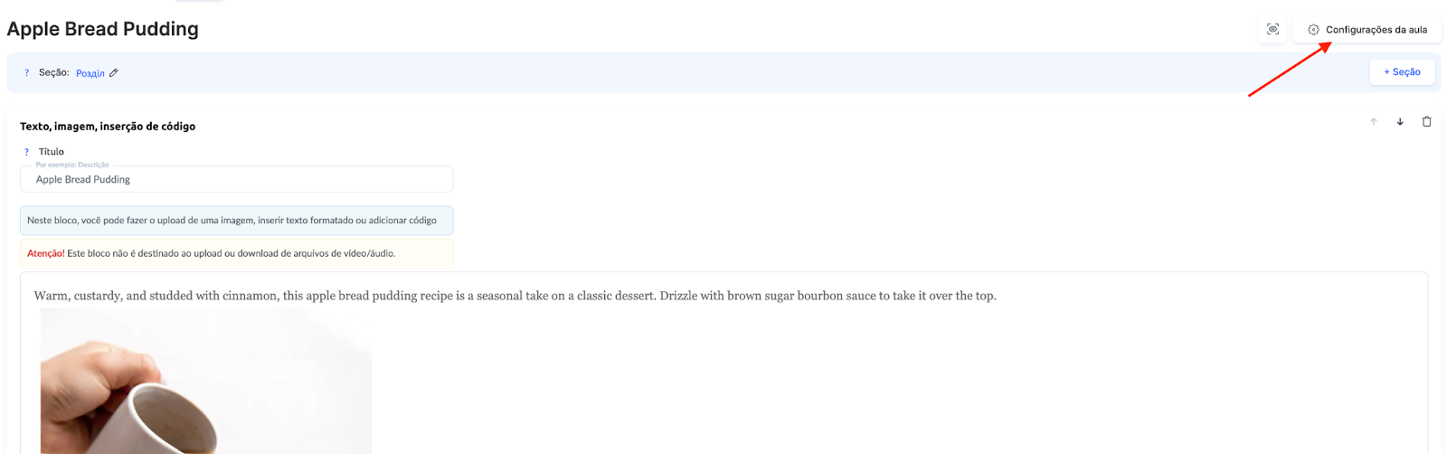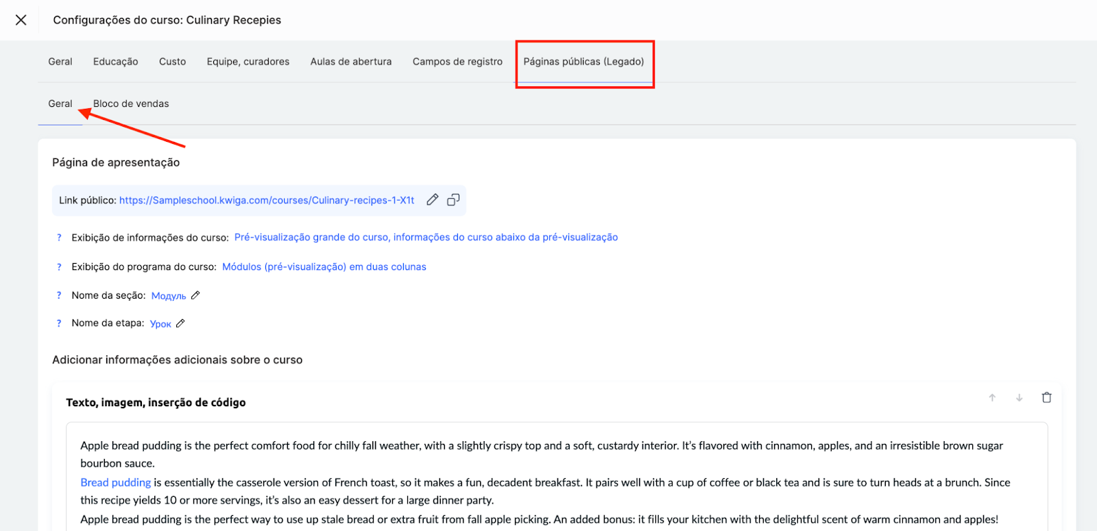 Para adicioná-lo, aceda às definições do curso, no separador Páginas públicas, role para baixo até ao bloco Página da aula / módulo – campo Bloco acima da aula.