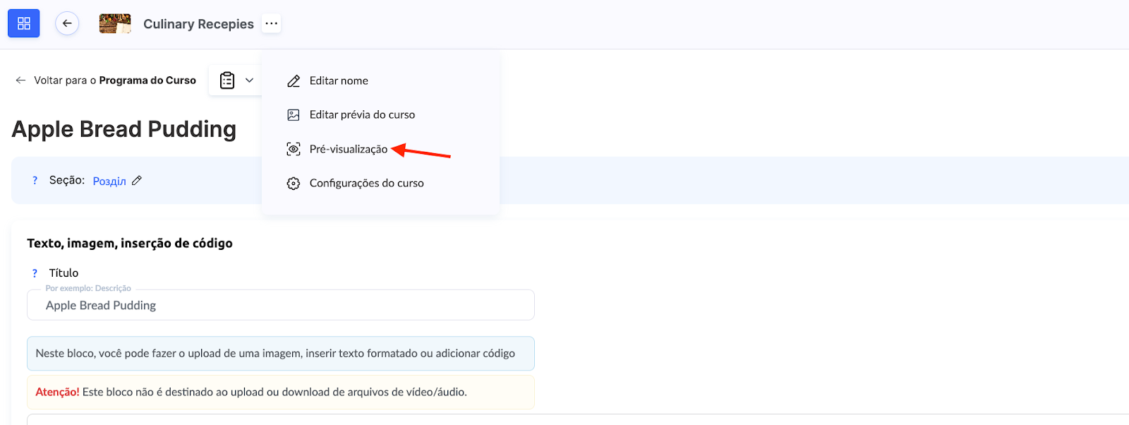 Antes de lançar um curso, é importante verificar como ele será visto pelos alunos. Para isso, a plataforma dispõe de uma função de Pré-visualização, que permite avaliar o design, verificar a correta exibição dos materiais e garantir que a estrutura do curso é conveniente para os utilizadores.