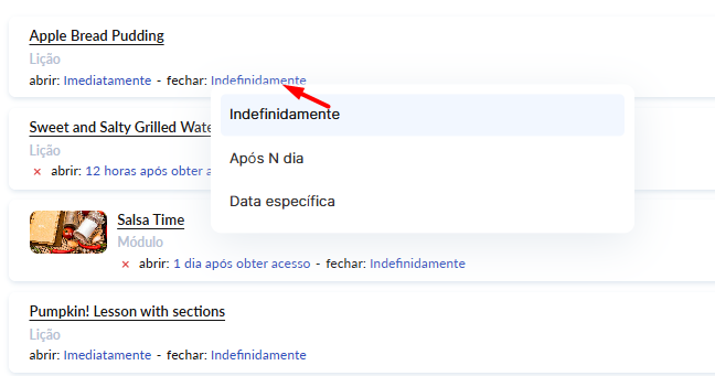 Indefinidamente: o acesso à aula permanece aberto sem restrições. Essa opção funciona bem para cursos com acesso permanente aos materiais.