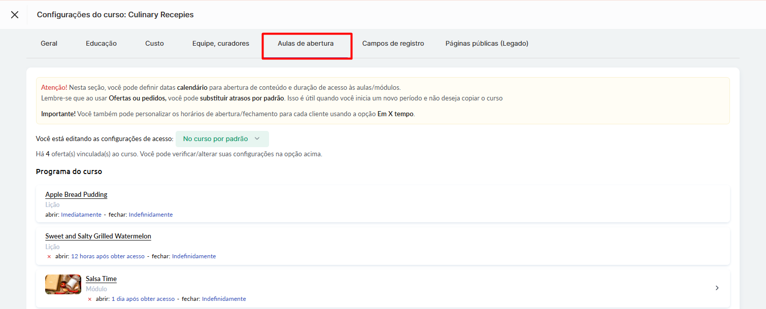 Observação: ao criar uma nova sessão de curso com um cronograma diferente, use ofertas para ajustar os atrasos em vez de duplicar o curso ou alterar os atrasos nas configurações da sessão atual. Leia mais no artigo: Como criar um novo cronograma de aulas.