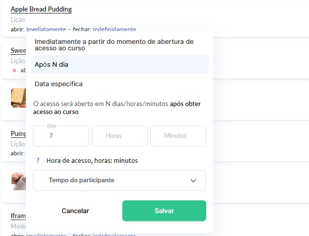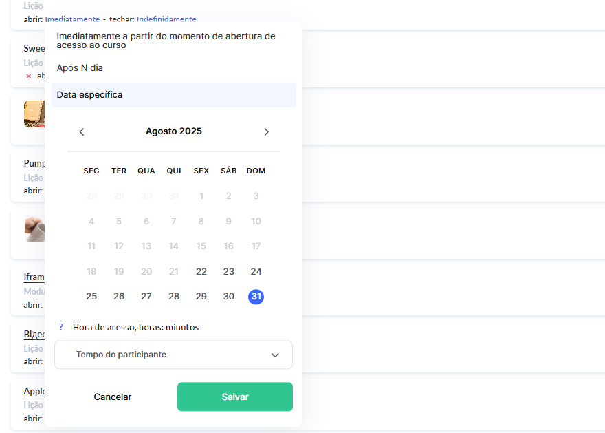 Data específica: O acesso à aula é concedido em um dia e horário claramente definidos. Por exemplo, se o curso começa no dia 1º do mês, mas uma aula específica só deve estar disponível no dia 15, esta opção é ideal. Você pode configurar o horário exato em que a aula deve ser aberta. Hora do Participante: A aula abrirá considerando o momento em que cada participante ganhou acesso ao curso por meio de uma oferta específica, tornando o horário único. Exemplo: se um participante compra o curso às 15h56 e a aula tem um atraso de 2 dias, o acesso será liberado exatamente 2 dias depois, às 15h56. Hora Exata: Ao escolher esta opção, você define um horário universal de abertura para todos os participantes, como liberar o acesso a todos às 9h00.