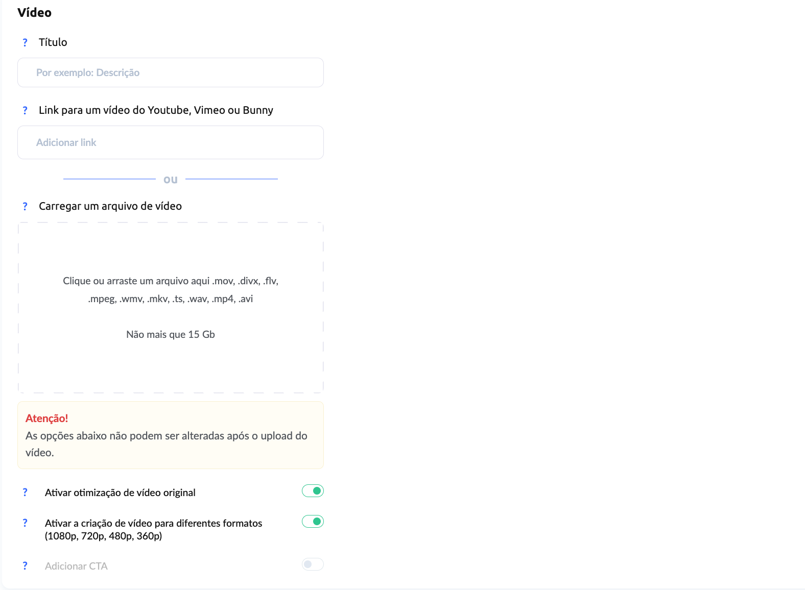 Pode carregar ficheiros de até 15 GB nos seguintes formatos: .mov, .mp4, .3gp, .divx, .flv, .mpeg, .mpg, .wmv, .mkv. Importante: o vídeo é adicionado automaticamente à biblioteca multimédia.