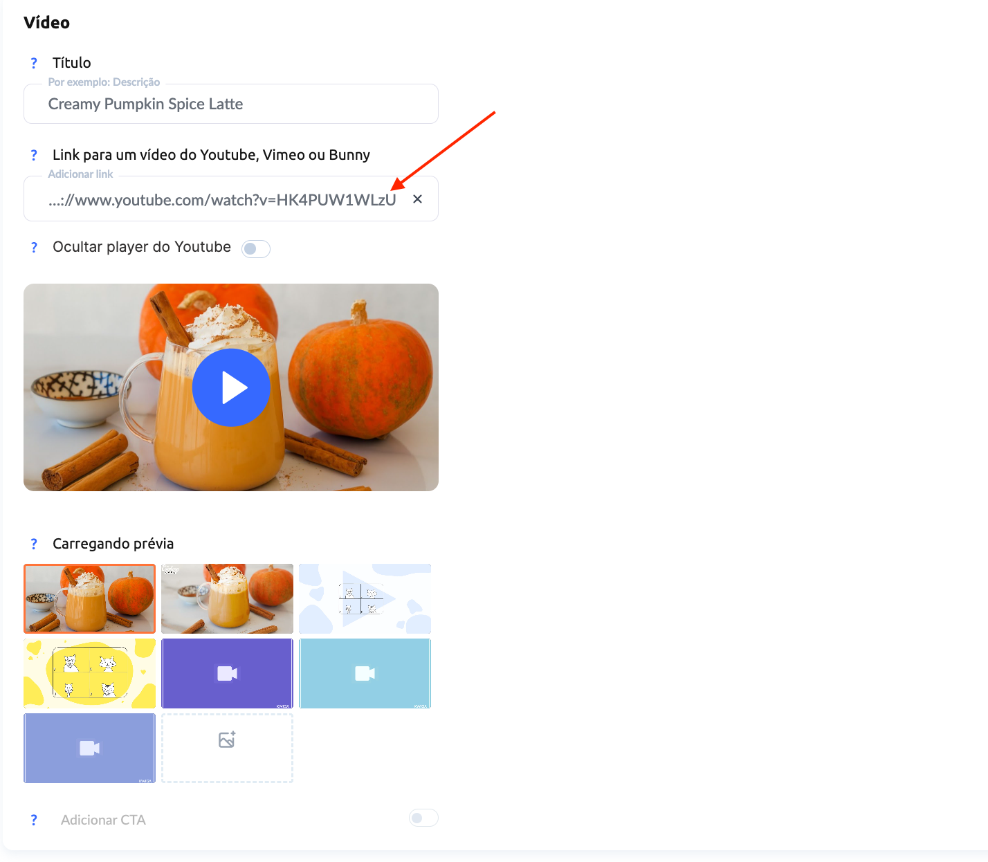 No KWIGA, existe a opção de adicionar vídeos do seu canal do YouTube. Para isso, basta inserir o link do vídeo, conforme mostrado na imagem.
