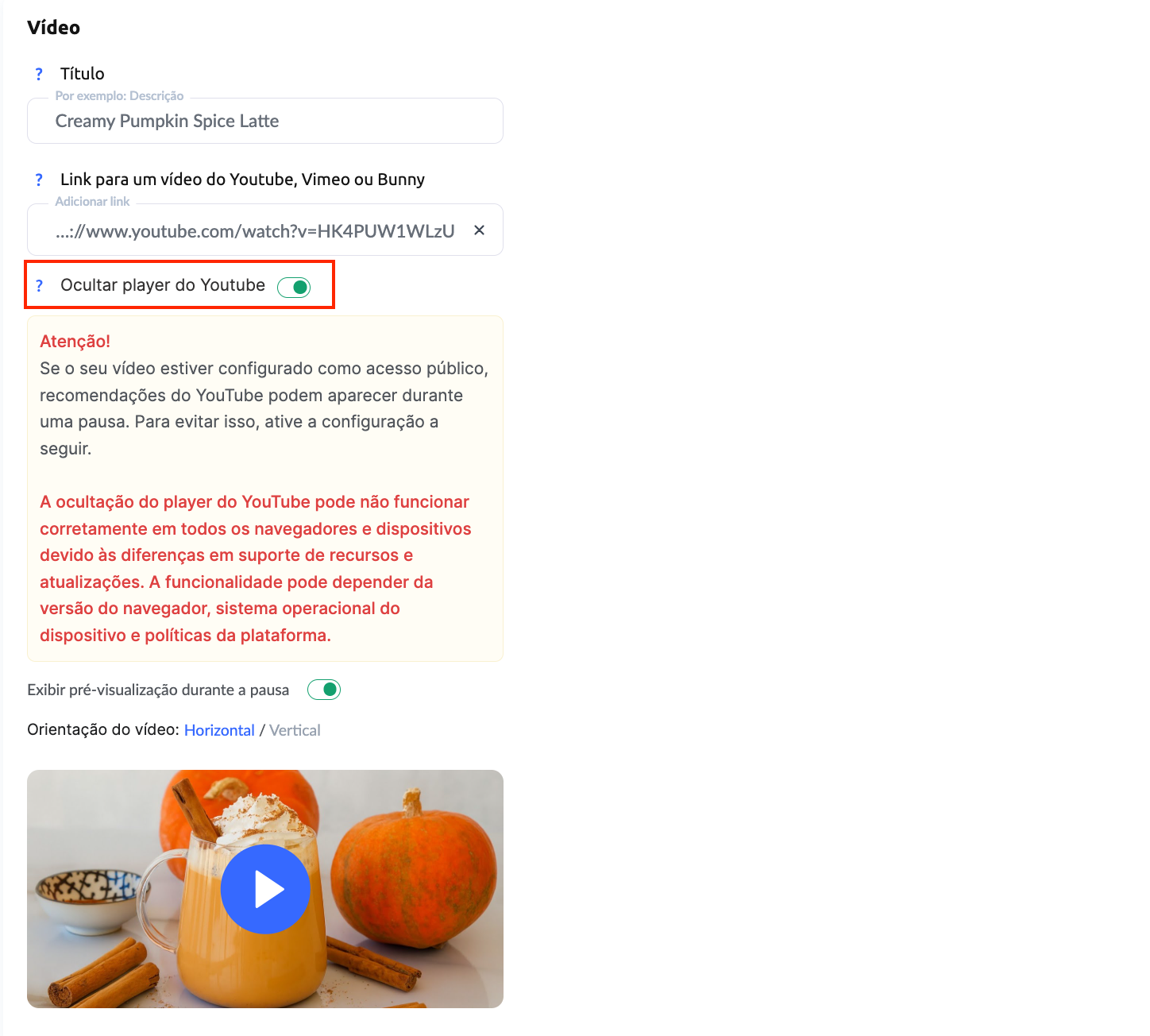 Ao usar o YouTube e fornecer o link, pode ocultar o reprodutor do YouTube usando o botão correspondente.