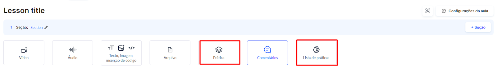Prática: Utilize esta opção se o campo fizer parte dos materiais da lição e aparecer diretamente abaixo do conteúdo da lição.