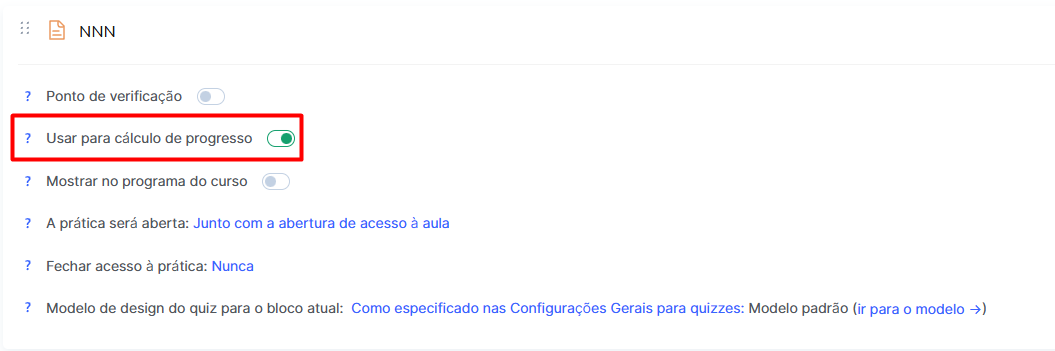 Uma vez que este campo tem uma função complementar e não faz parte do programa principal de aprendizagem, é importante excluí-lo do progresso do curso.
