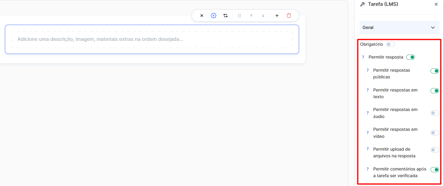 Configure os tipos de resposta: ative respostas em texto; permita comentários após a revisão; se necessário, autorize o carregamento de arquivos (por exemplo, capturas de ecrã).