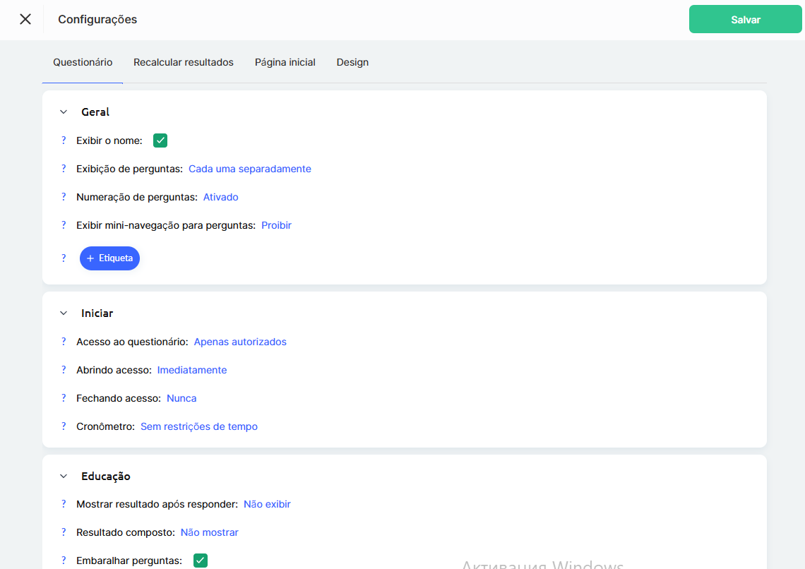 Após criar o quiz, pode ajustar os seus parâmetros conforme as necessidades do suporte técnico, por exemplo: