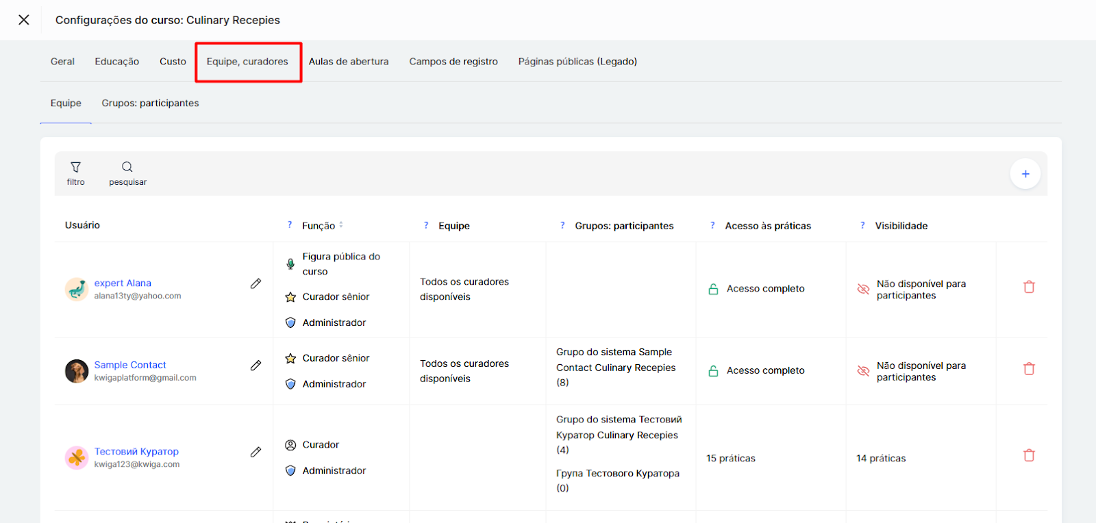 Se um membro específico da equipa for responsável por gerir as perguntas técnicas, pode restringir o acesso a estas atividades apenas a determinados curadores. As configurações estão disponíveis diretamente no curso, no separador Equipa → Curadores.