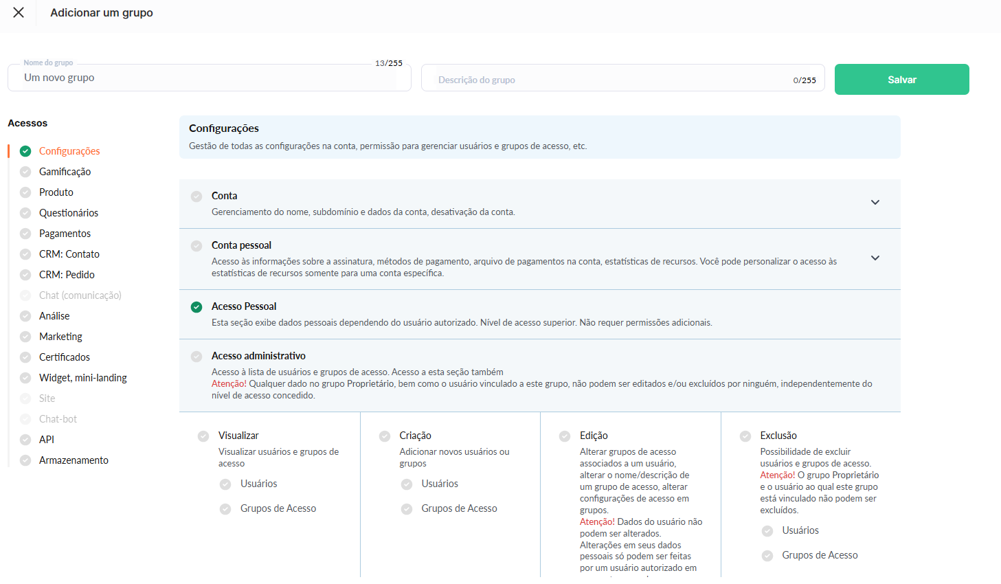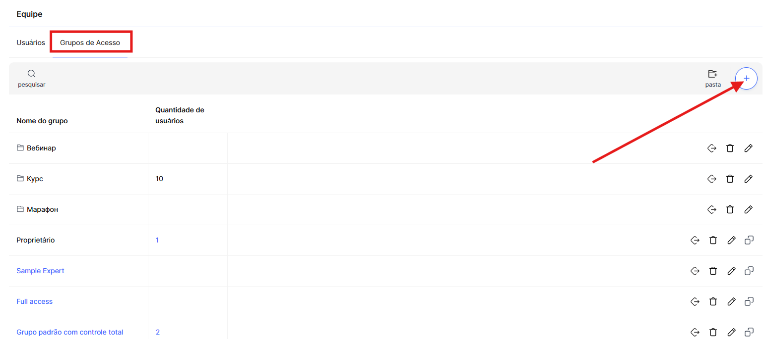 Na aba Grupos de Acesso, crie um grupo que define a quais seções da plataforma os membros da sua equipe terão acesso.