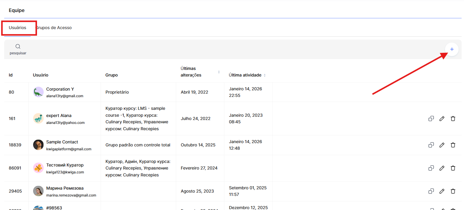 Se for necessário conceder a um usuário acesso a um curso específico, recomendamos configurar isso pelo menu: Cursos → Equipe, curadores e grupos de alunos.