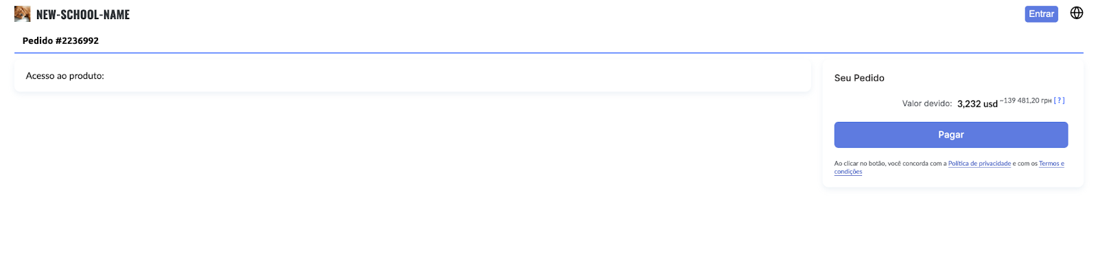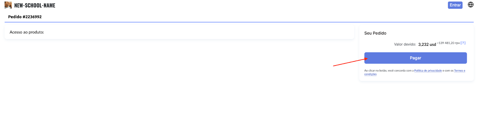 Se você permitir pagamentos sem autorização, após o carregamento da página da oferta, quando o cliente clicar no botão “Pagar”, ele será direcionado diretamente para a página de pagamento (na captura de tela abaixo, o cliente não está autenticado — basta clicar no botão “Pagar”).