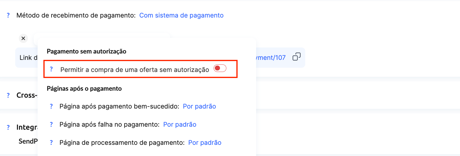 As configurações da oferta permitem que os clientes realizem pagamentos sem autorização. Isso significa que o cliente paga primeiro e só depois pode fazer login.