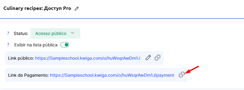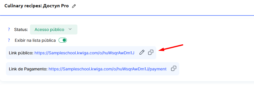 Antes de criar a mini landing page, você precisa criar a oferta no Kwiga. Isso inclui definir o preço e as condições de compra, configurar o acesso ao curso ou produto após o pagamento, adicionar uma descrição que aparecerá na página da oferta e assim por diante. Copie o link público da oferta.