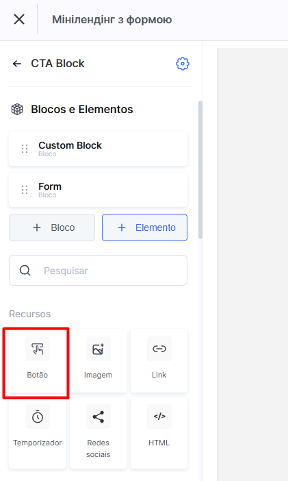 Em seguida, no construtor da mini landing page, você precisa adicionar um elemento Botão no local desejado da página.