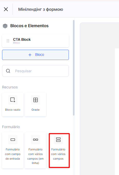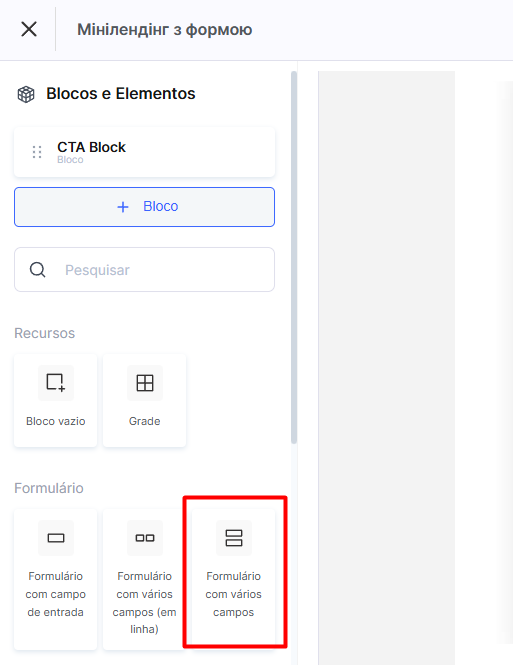 No construtor da mini landing page, você deve adicionar um bloco Formulário no local desejado da página.