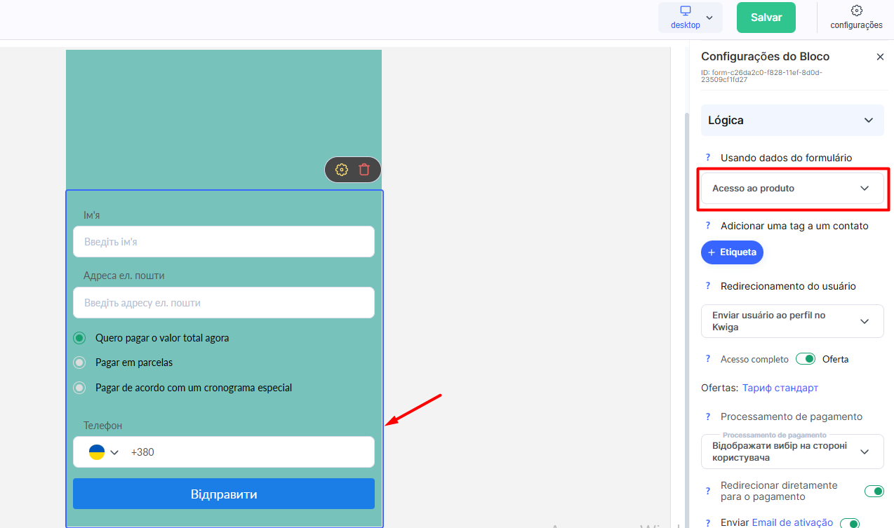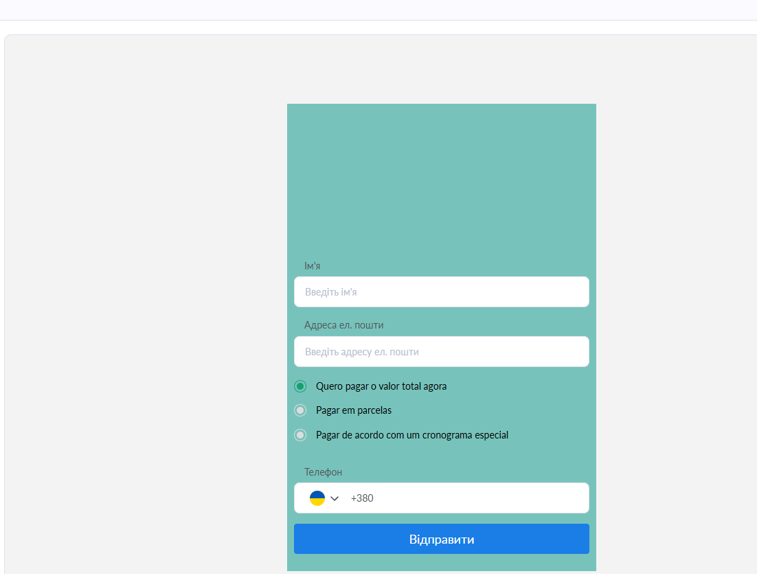 Observação: Não adicione um link para o sistema de pagamento nas configurações do widget, incluindo o botão. Quando o botão é clicado, os dados do formulário são enviados (um contato é criado automaticamente no CRM) e o usuário é redirecionado automaticamente para a página de pagamento da oferta.