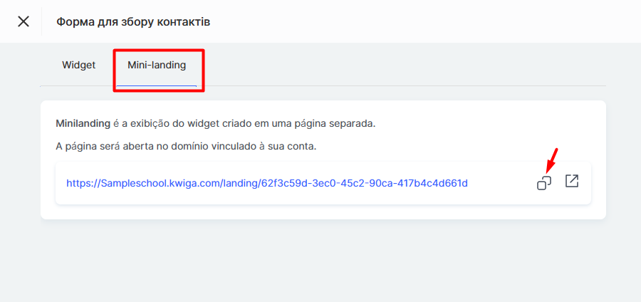Para este caso, você precisa criar e configurar um widget separado (um formulário de coleta de contatos) e uma mini landing page separada através do menu superior Site → Widget, Mini-landing, para que possa vinculá-los posteriormente.