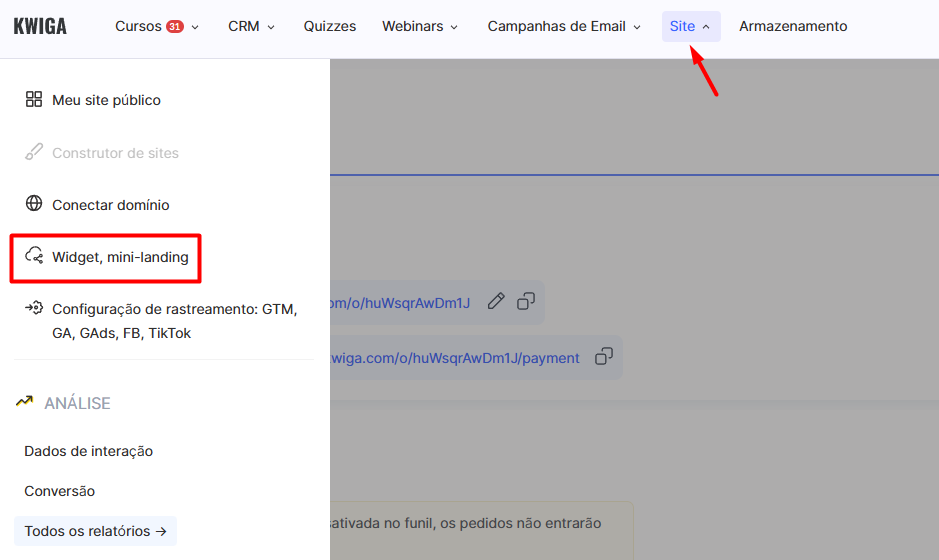 Se você precisa configurar rapidamente as vendas de cursos ou produtos, uma mini landing page no Kwiga permite criar páginas independentes com links e organizar as vendas diretamente na plataforma.
