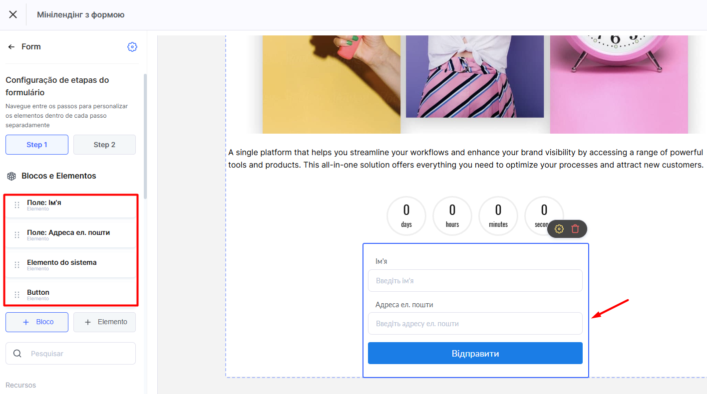 Usando o construtor, adicione os blocos e elementos necessários – texto, imagens, vídeos, formulários de contato, contadores, botões com diferentes cenários de venda.