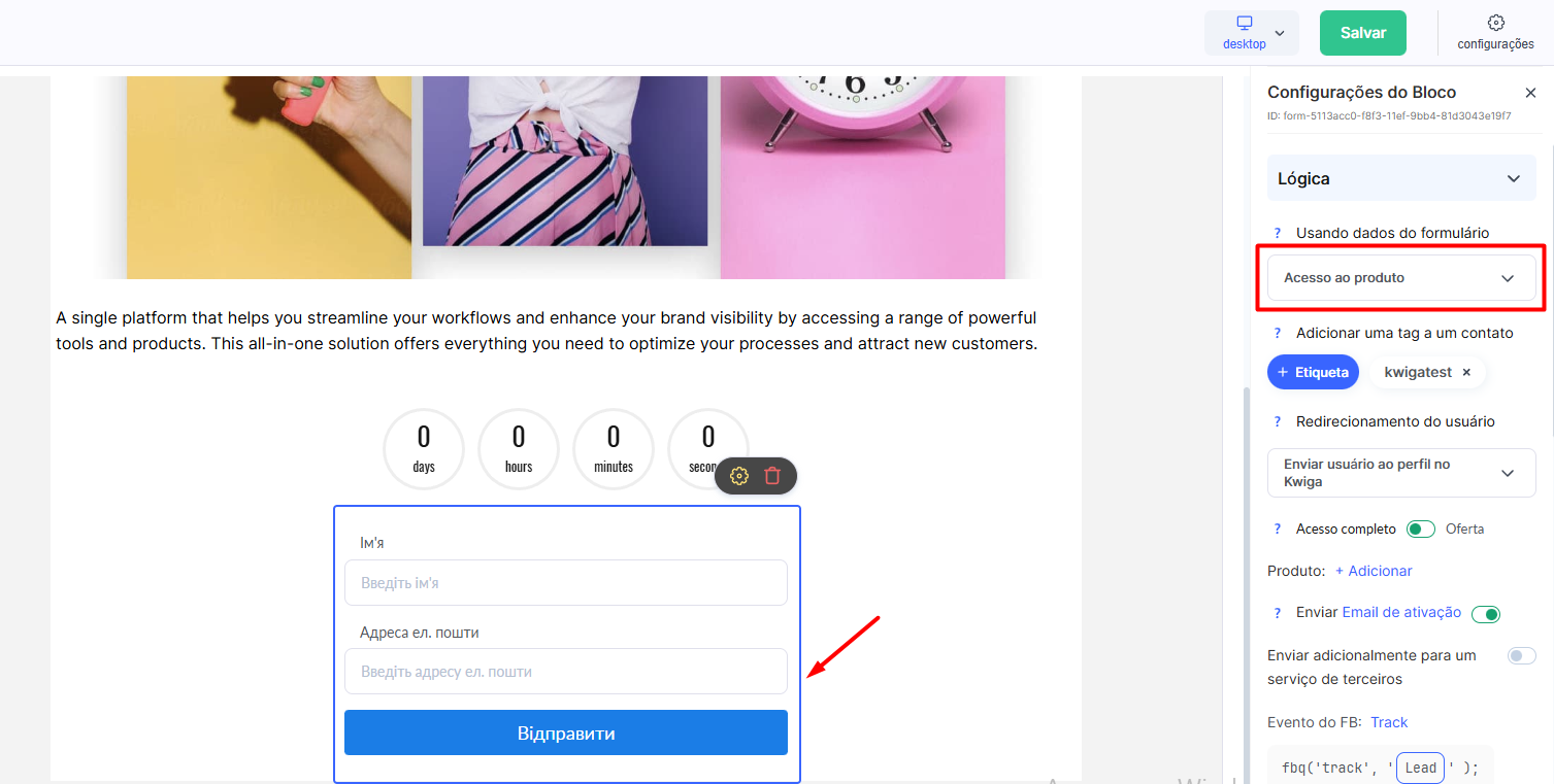 Se necessário, adicione as tags importantes para filtrar contatos no CRM e configure o redirecionamento — Enviar usuário para o perfil no Kwiga.