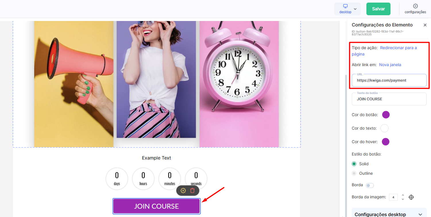 Nas configurações do botão, selecione o tipo de ação Redirecionar para página. Cole o link público copiado da oferta no campo URL.
