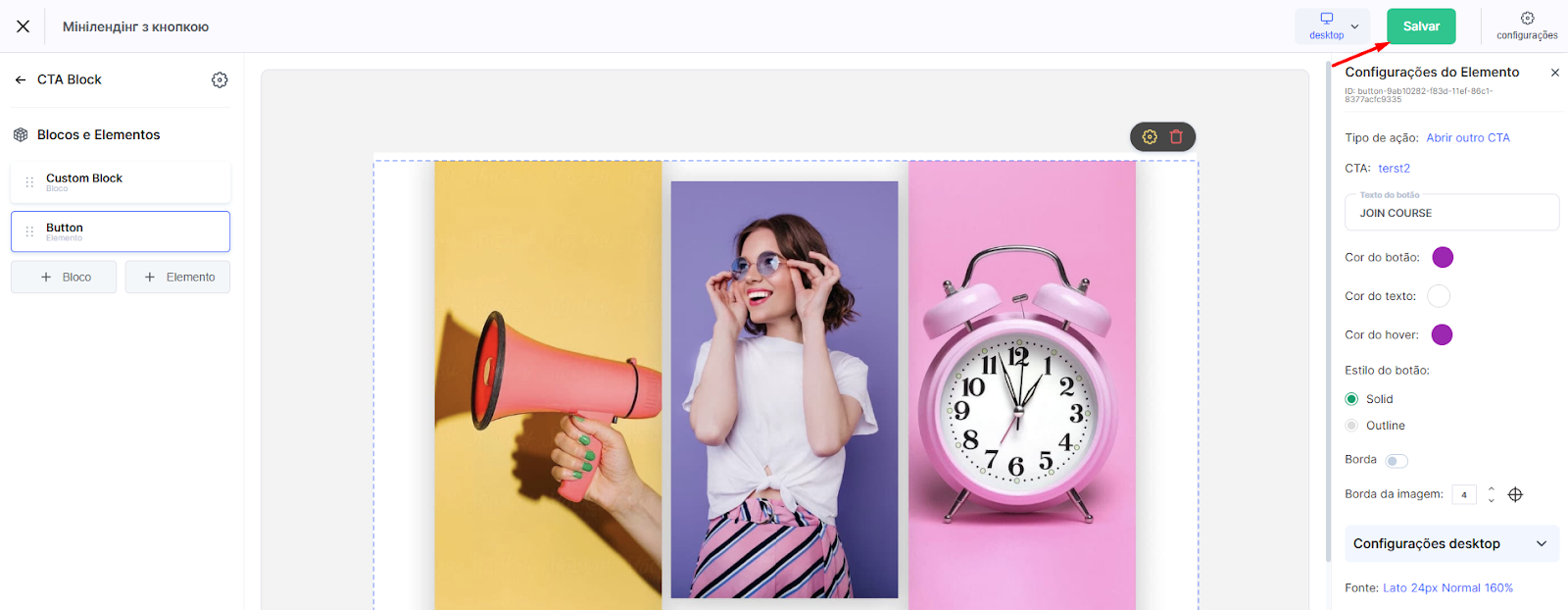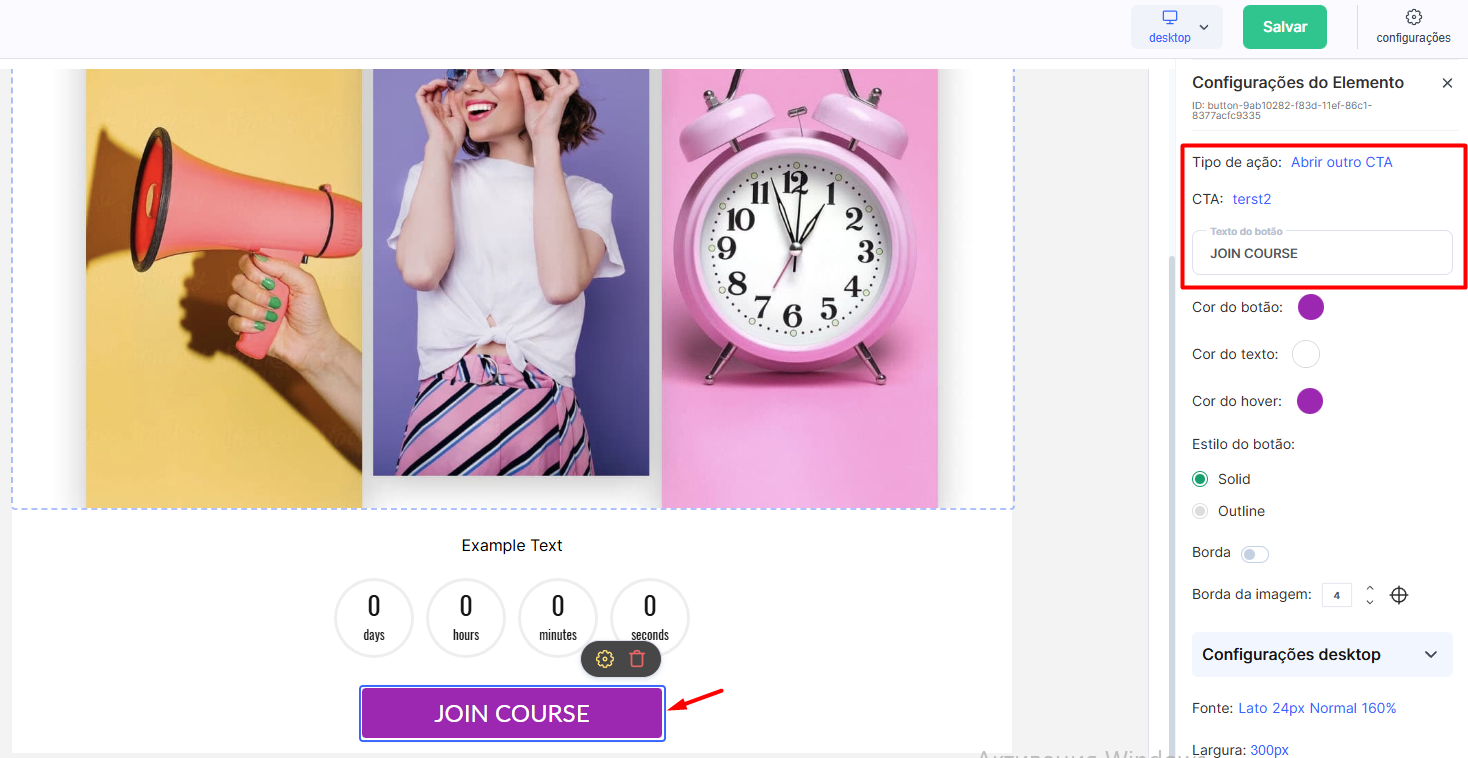 Após adicionar o botão, você precisa configurar sua ação. Clique no botão, abra as configurações e selecione o tipo de ação Abrir outro CTA. Escolha o nome do widget criado anteriormente.